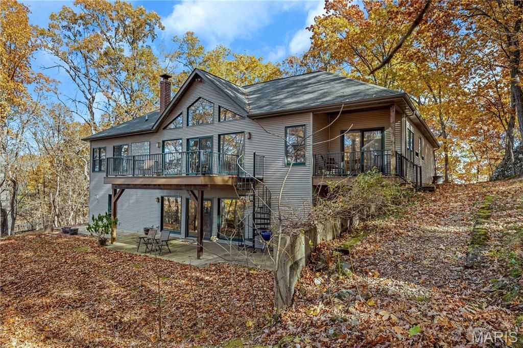 Experience peaceful country living in the Black Forest Subdivision just outside Hermann, Missouri. This inviting home rests on 24± wooded acres overlooking a stunning valley and offers access to a large, shared lake. Designed for comfort and efficiency, the home features 2x6 insulated walls, a geothermal HVAC system, and underground utilities. Inside, a welcoming foyer opens to a spacious common area that connects the living room, kitchen, and dining area, offering breathtaking woodland views. The main level offers convenient living, featuring a master suite, laundry area, and two additional bedrooms, along with an oversized two-car garage for easy access. The finished lower level features a family room, two additional bedrooms or office spaces, a workshop, and ample storage. Wood stoves on both levels provide cozy warmth in winter. Natural landscaping, bluffs, and boulders create a park-like setting where wildlife abounds, your own private forest retreat just minutes from Hermann.
